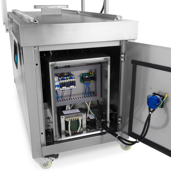 Mit insgesamt vier 60 cm langen Schweißbalken (zwei pro Kammer) verschweißt diese Maschine in kürzester Zeit eine beeindruckende Menge an Beuteln. Angetrieben von zwei Hochleistungs-Vakuumpumpen (2 x 20 m³/h) und zwei kraftvollen Motoren (2 x 750 W) garantiert sie Schnelligkeit und Zuverlässigkeit. Der komplett aus Edelstahl gefertigte Rahmen steht trotz seines Gewichts von 278 kg auf vier Rollen und lässt sich so leicht bewegen. Sie ist das ultimative Werkzeug für den industriellen Einsatz.
