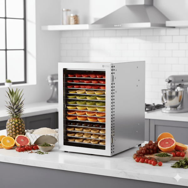 Dieser Dörrautomat wurde für Lebensmittelprofis entwickelt und eignet sich für Gastronomen, Hoteliers, Obst- und Gemüseproduzenten, Caterer, Gärtner und Verbraucher, die Wert auf ihre Ernährung legen. Der Dörrautomat aus Edelstahl verfügt über eine höhere Trocknungskapazität als Verbrauchermodelle und verarbeitet so größere Mengen Lebensmittel in kürzerer Zeit. Er verfügt über ein Touchscreen-Bedienfeld, mit dem Sie Dörrzeit und -temperatur präzise einstellen können.
